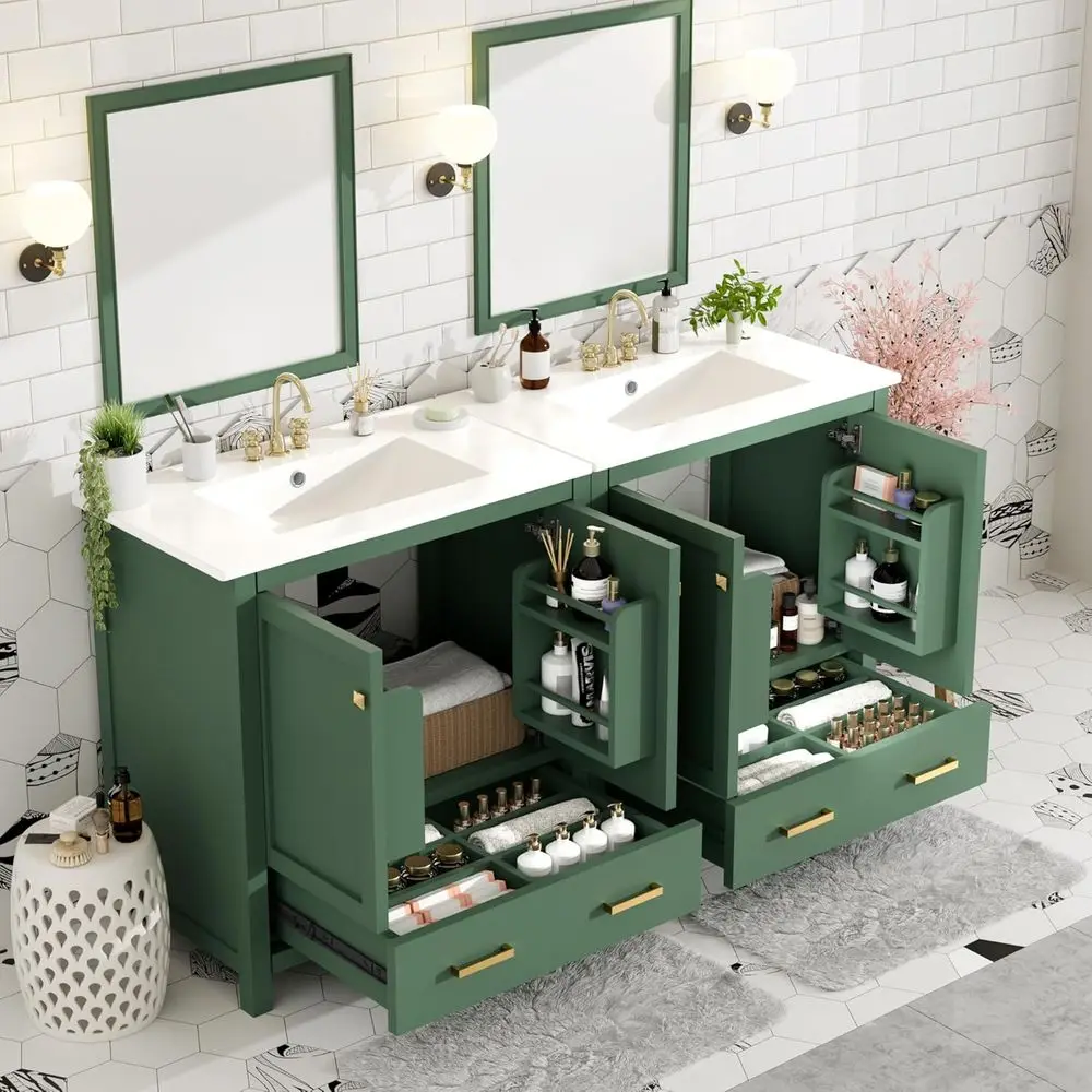 Green 60 Double Vanity Set with Soft-Close Doors, Ceramic Sinks, and Ample Storage for Modern Bathrooms