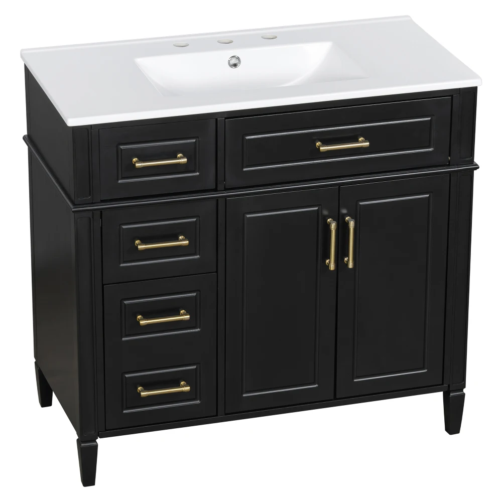 36 inch bathroom vanity with sink, 4 drawers vanity, adjustable shelves, ceramic basin, gold metal handle, soft close hinge